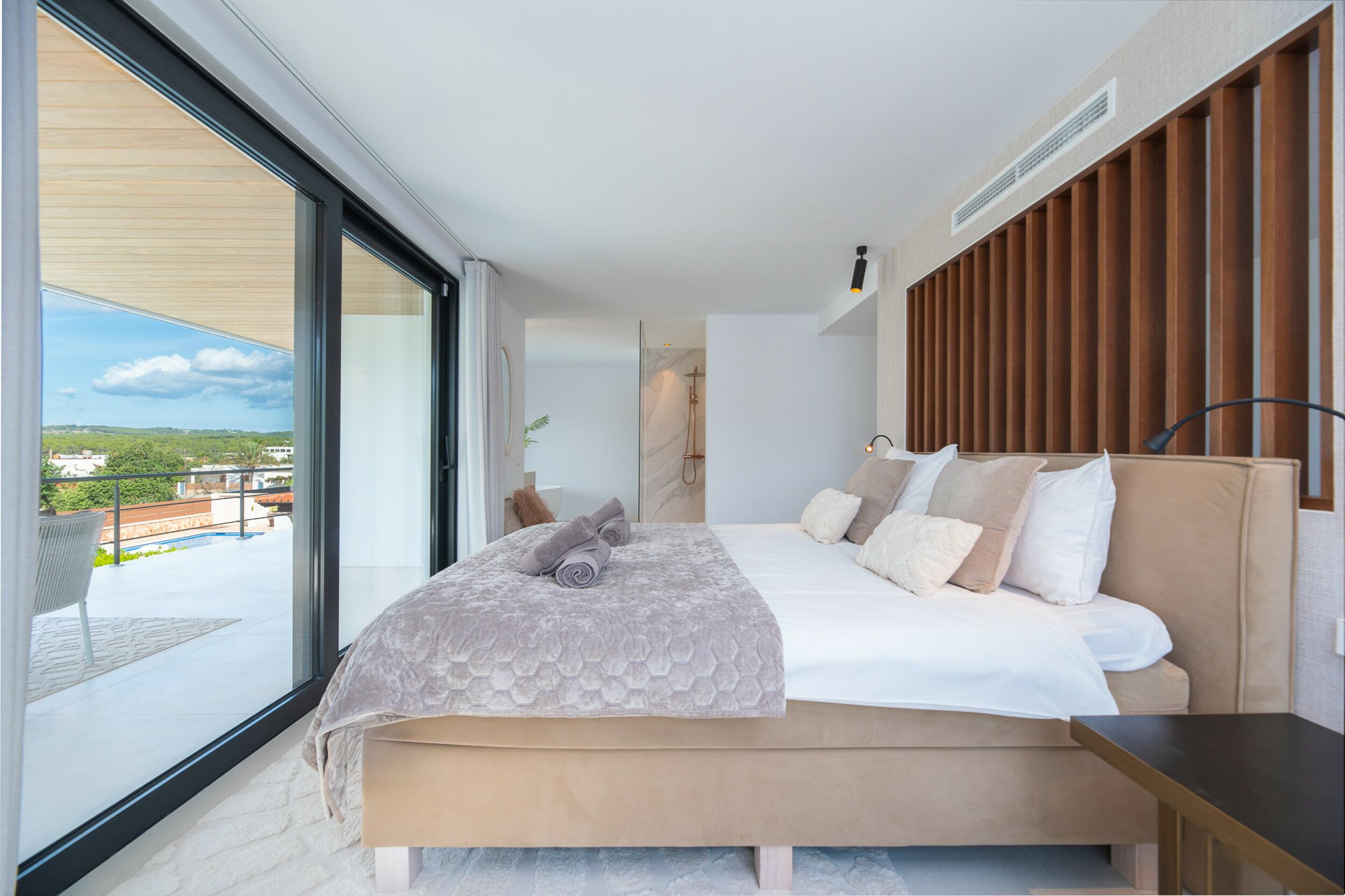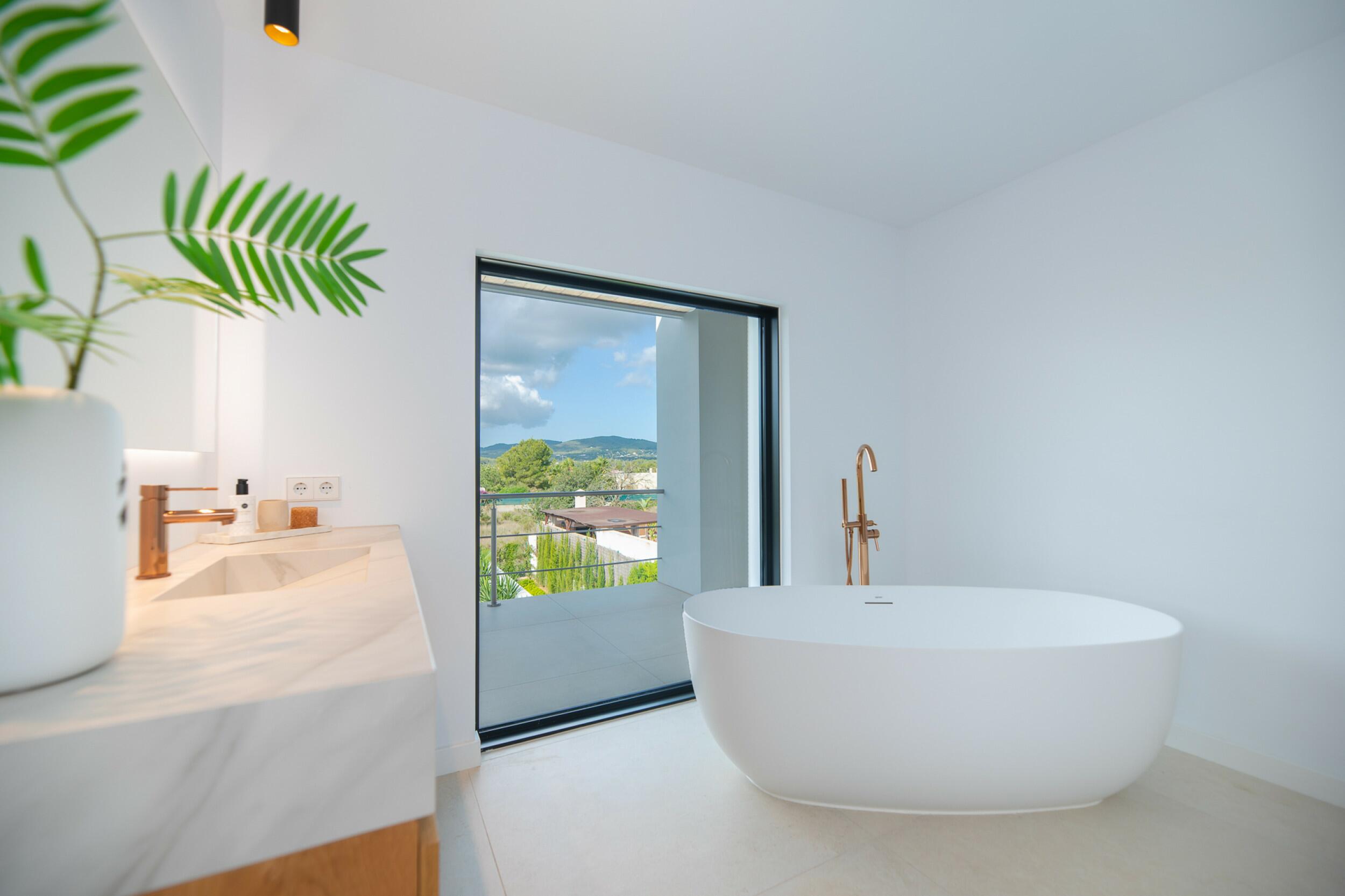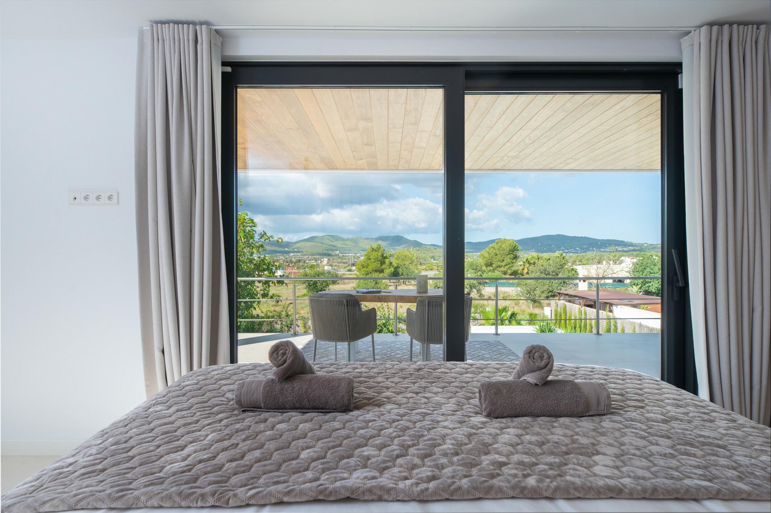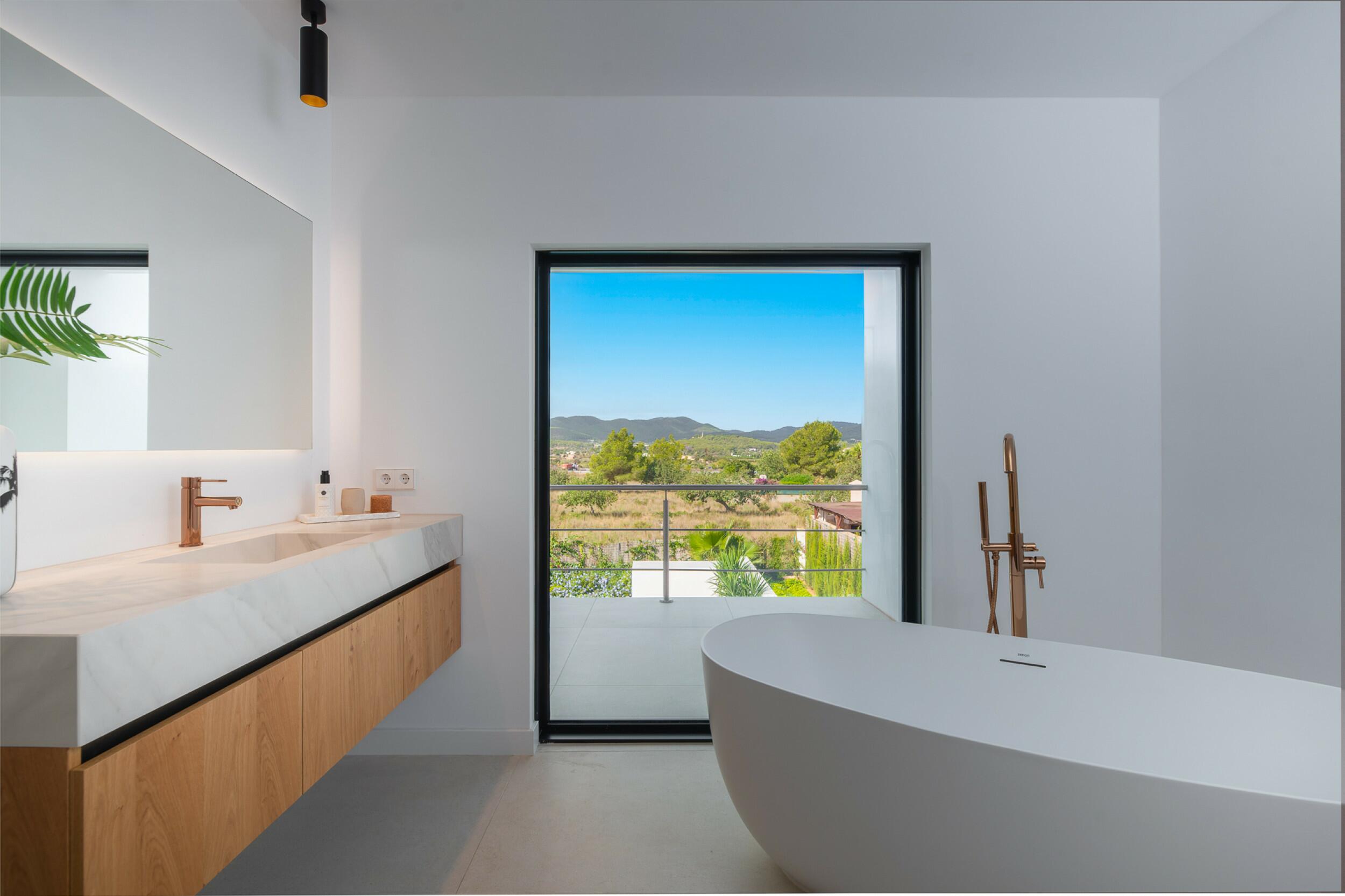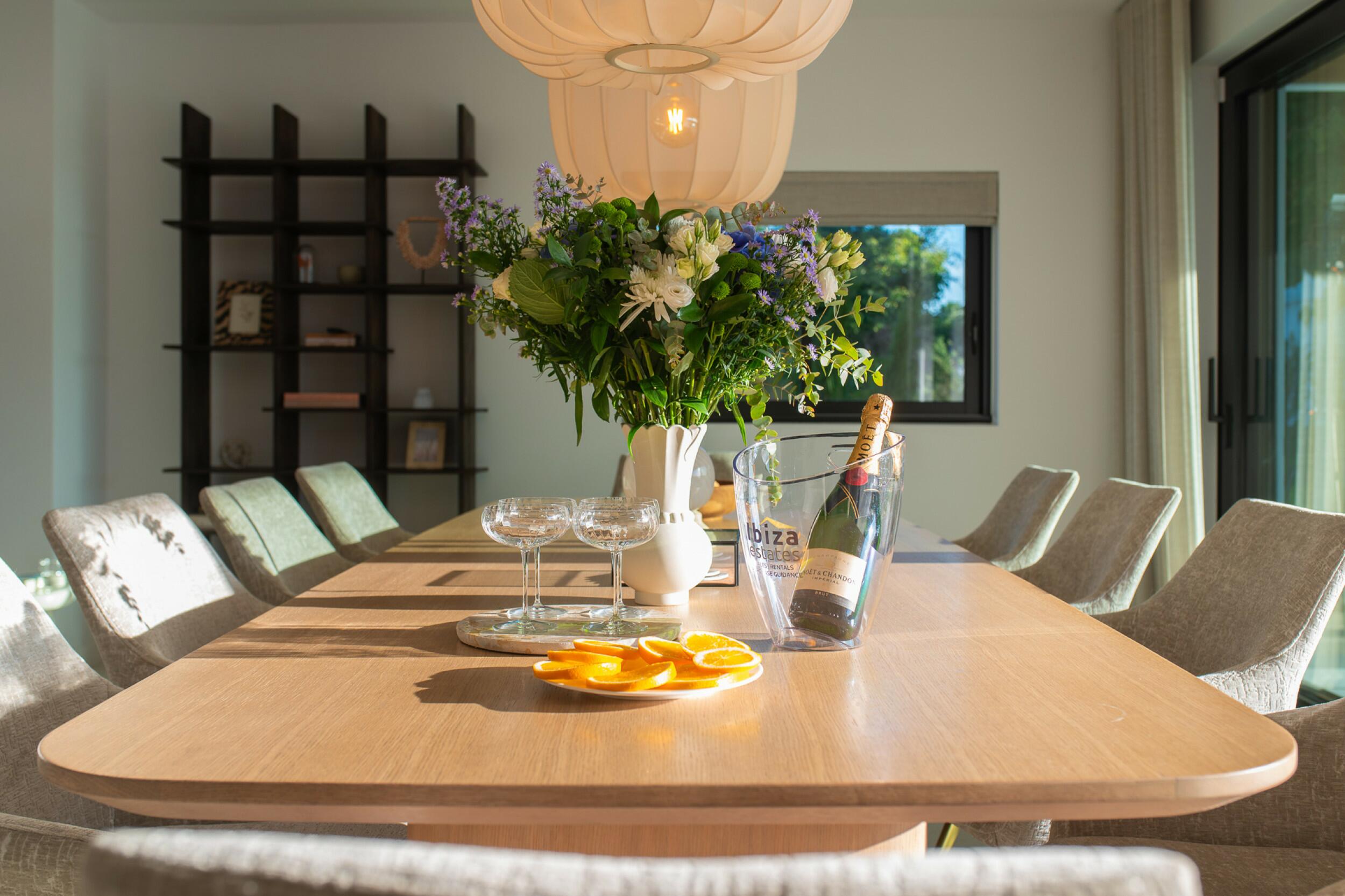 La casa è distribuita su due piani più il seminterrato. All'ingresso principale si accede da una bella scala e si entra in casa attraverso un'elegante porta in legno. Al piano principale si trova un ampio e luminoso soggiorno con grandi finestre e camino, una spaziosa cucina semi-aperta, una sala da pranzo e un bagno per gli ospiti. Sia il soggiorno che la sala da pranzo si aprono su un'ampia terrazza esterna coperta. Al piano superiore si trovano 2 camere matrimoniali che condividono un bagno, una camera doppia con bagno privato e la camera padronale con bagno privato e spogliatoio. Le viste dalle camere da letto sono meravigliose, in quanto si affacciano sul giardino e da alcune camere, o dalle terrazze, si può persino vedere Dalt Vila e Formentera.