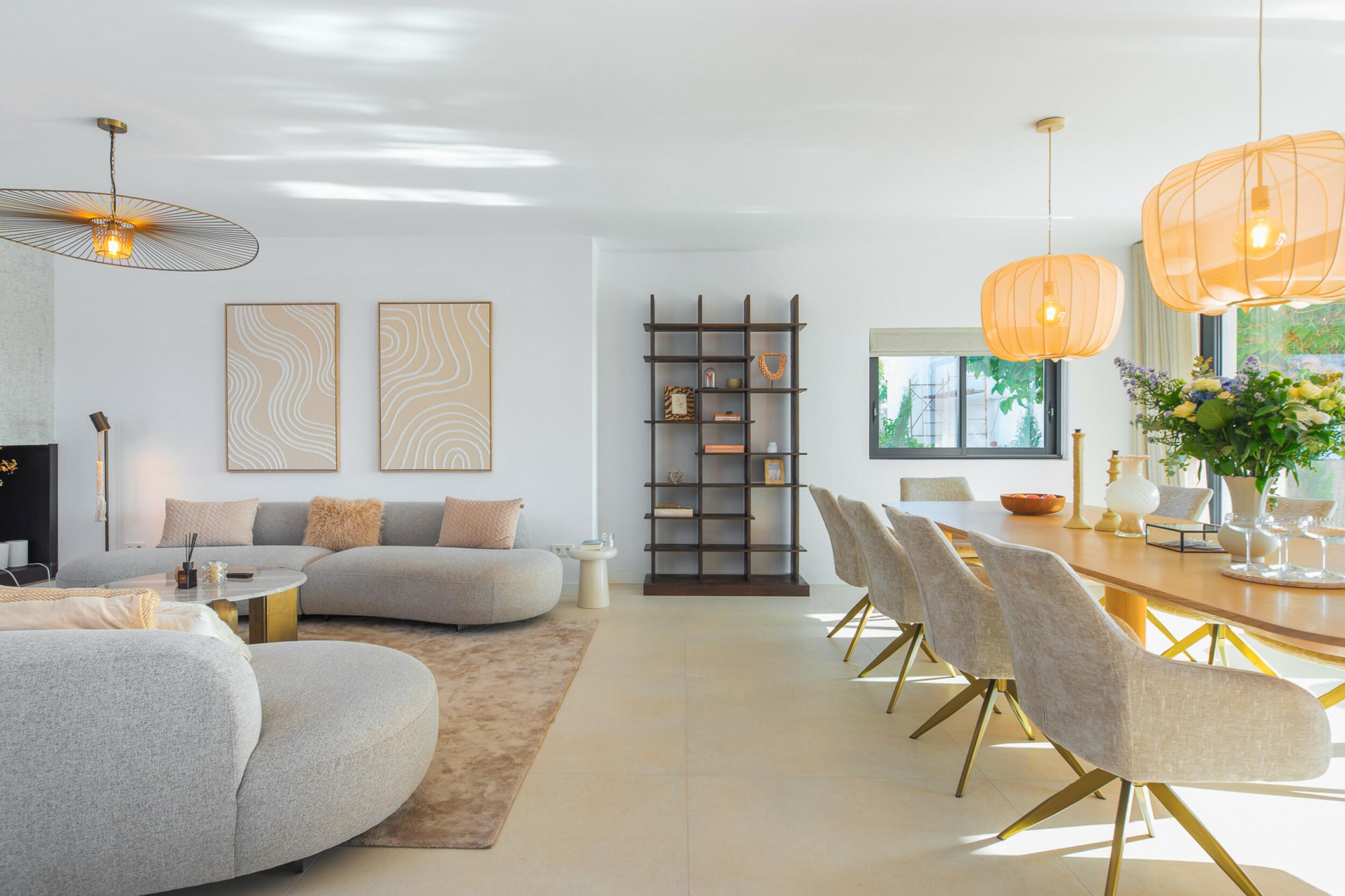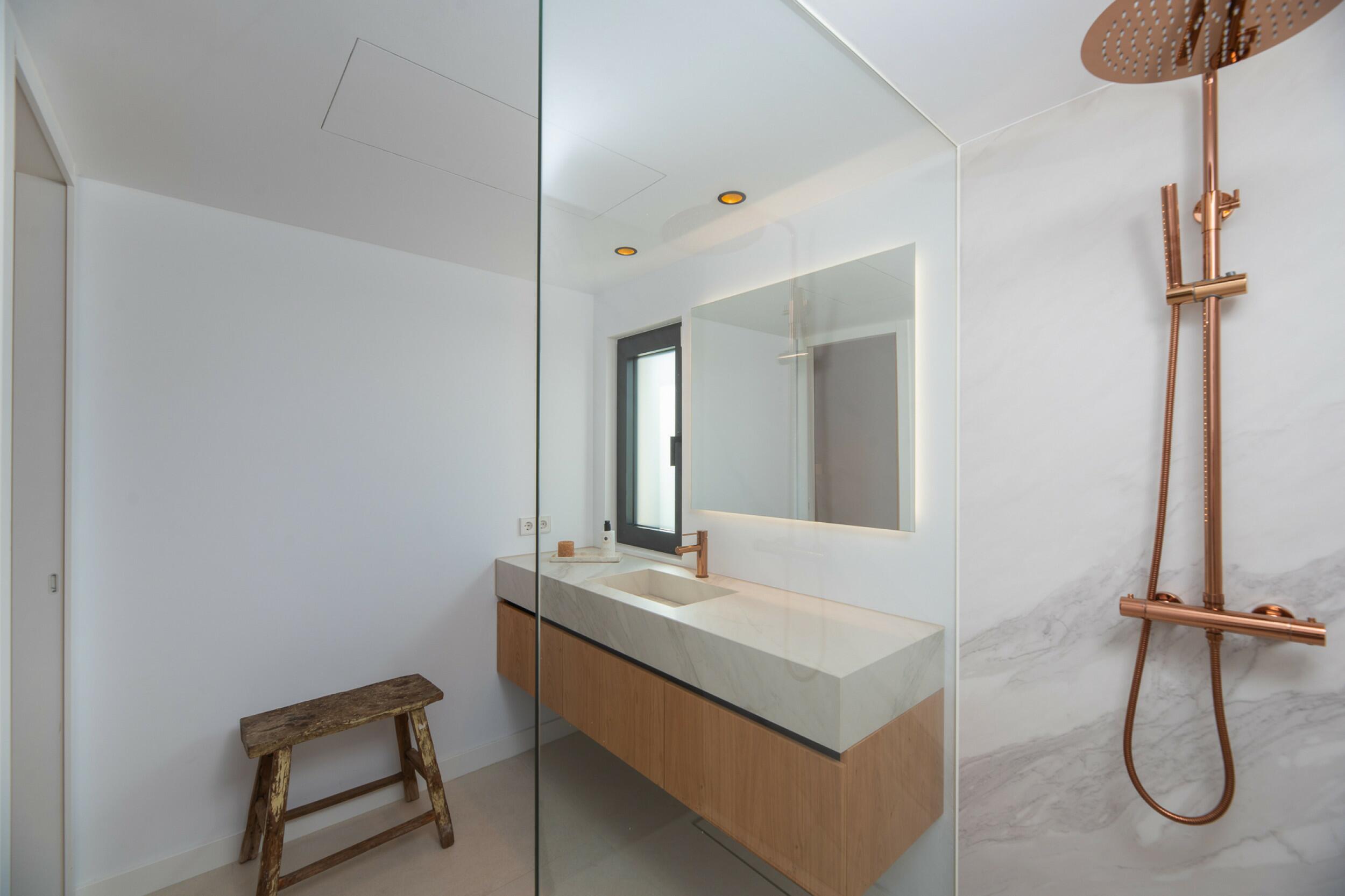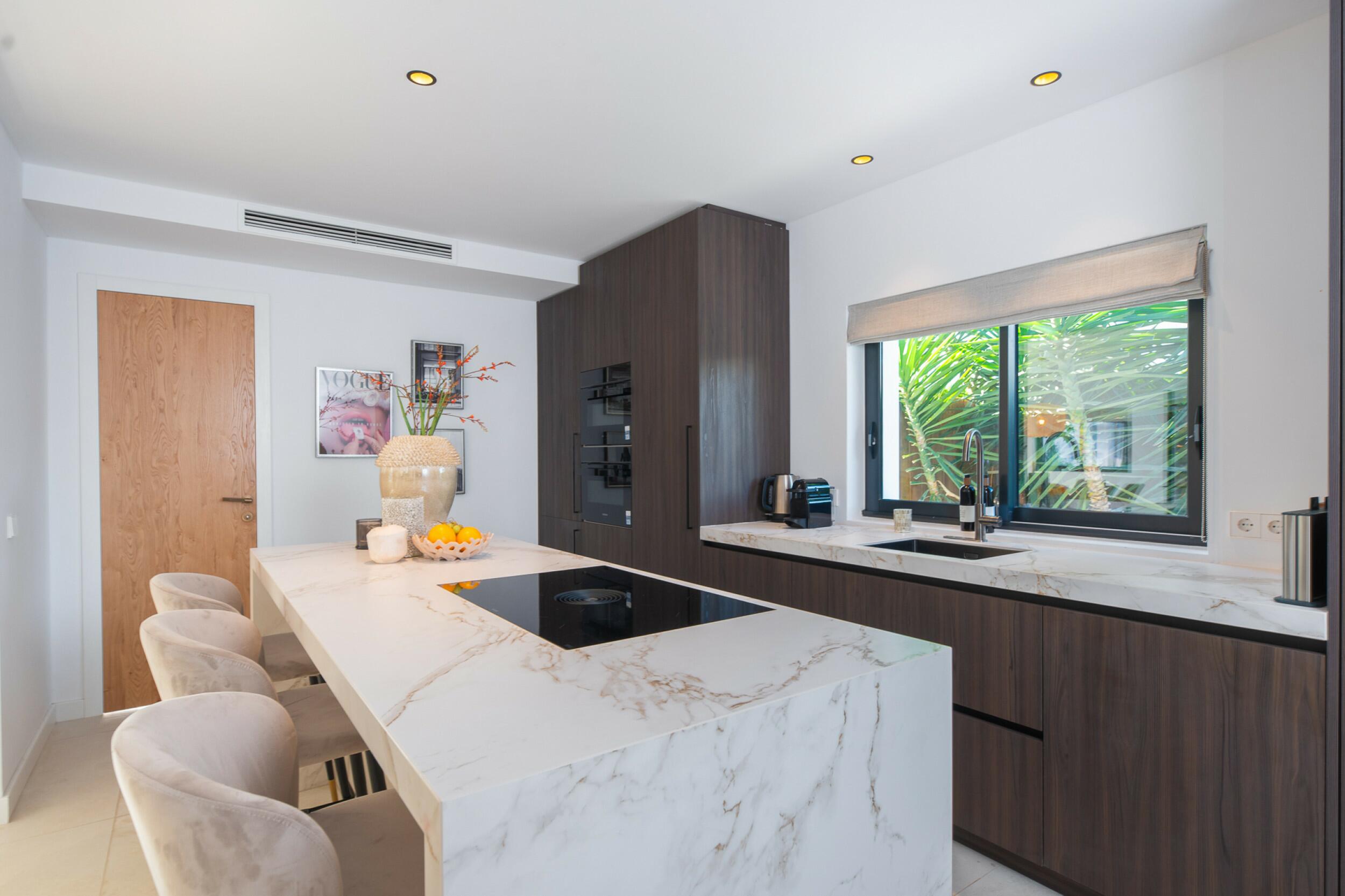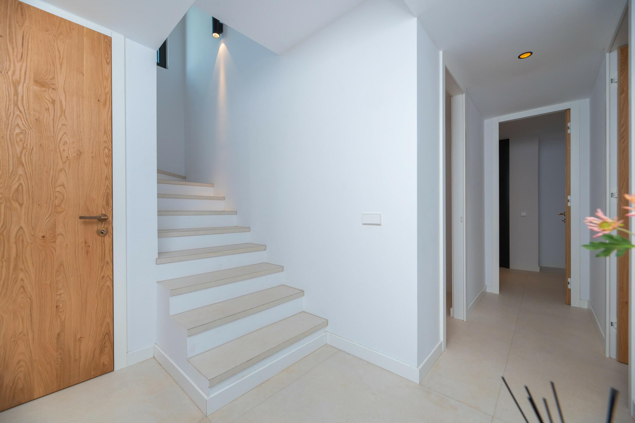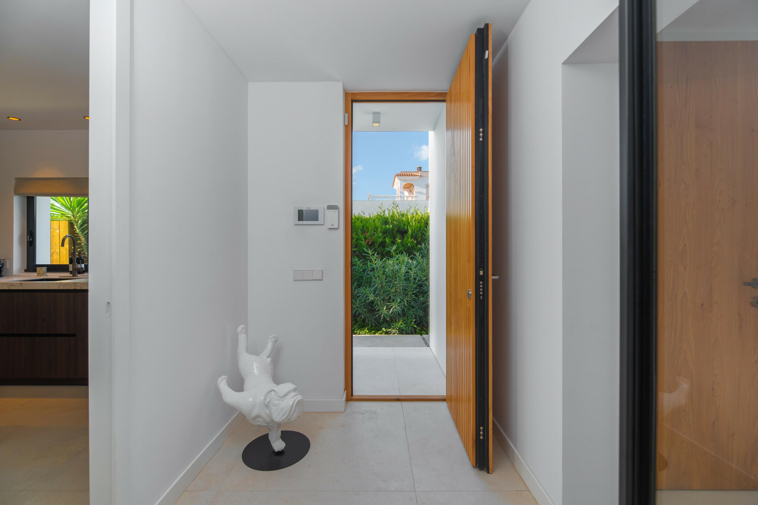 La casa è distribuita su due piani più il seminterrato. All'ingresso principale si accede da una bella scala e si entra in casa attraverso un'elegante porta in legno. Al piano principale si trova un ampio e luminoso soggiorno con grandi finestre e camino, una spaziosa cucina semi-aperta, una sala da pranzo e un bagno per gli ospiti. Sia il soggiorno che la sala da pranzo si aprono su un'ampia terrazza esterna coperta. Al piano superiore si trovano 2 camere matrimoniali che condividono un bagno, una camera doppia con bagno privato e la camera padronale con bagno privato e spogliatoio. Le viste dalle camere da letto sono meravigliose, in quanto si affacciano sul giardino e da alcune camere, o dalle terrazze, si può persino vedere Dalt Vila e Formentera.