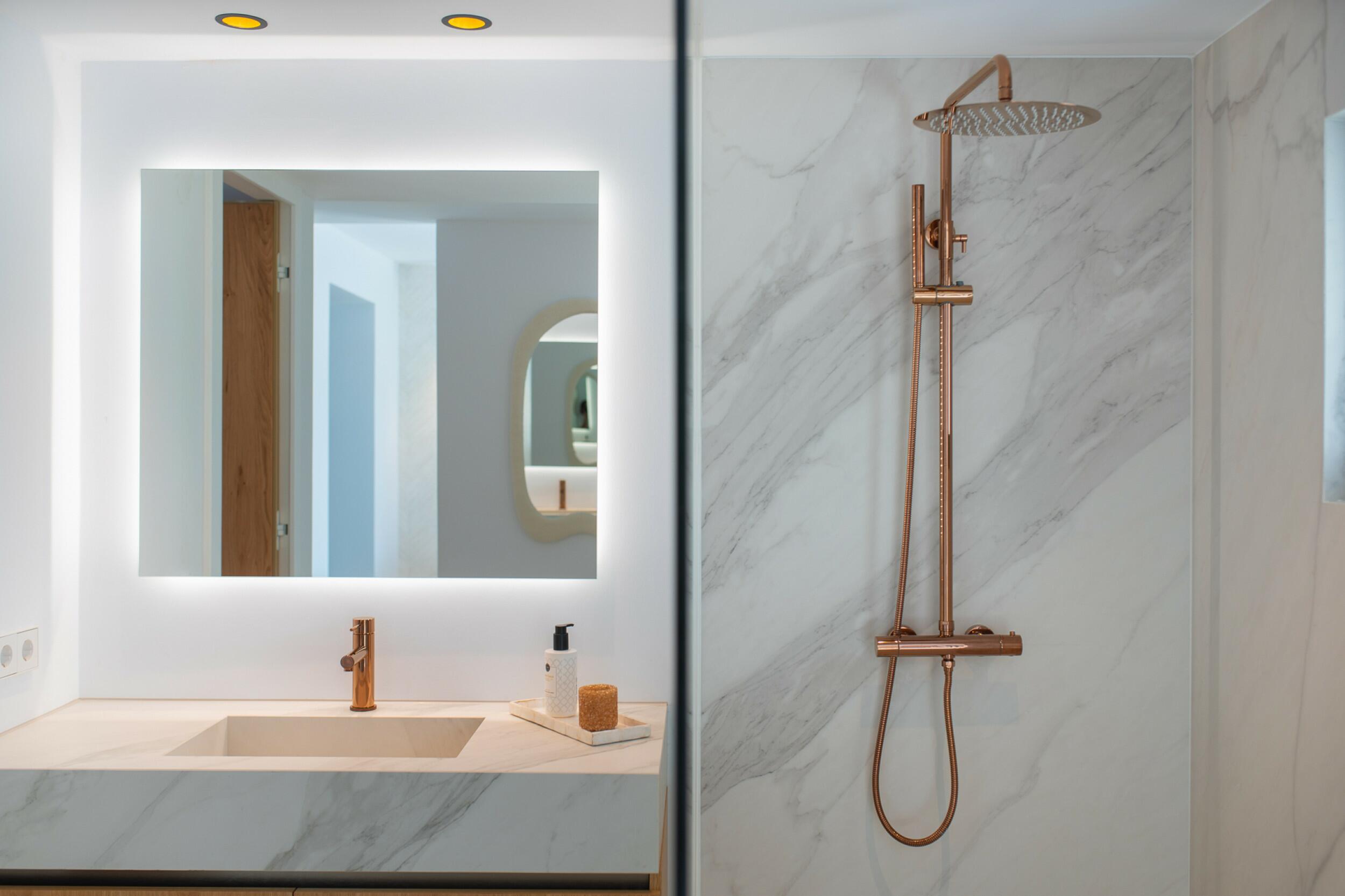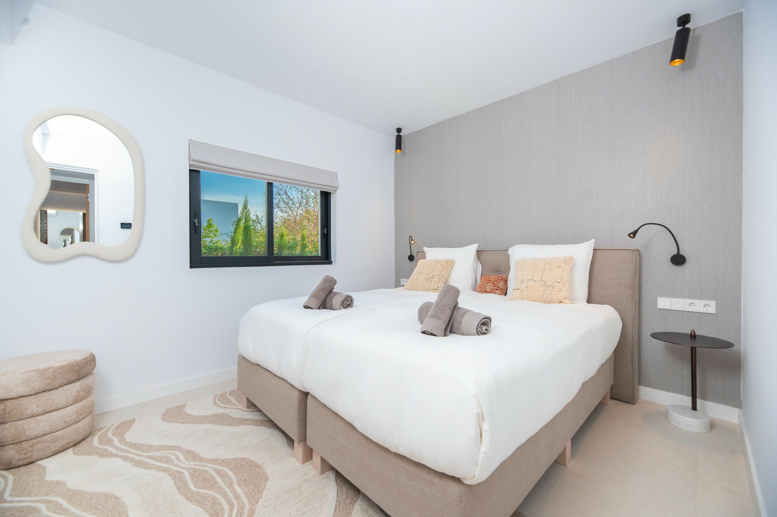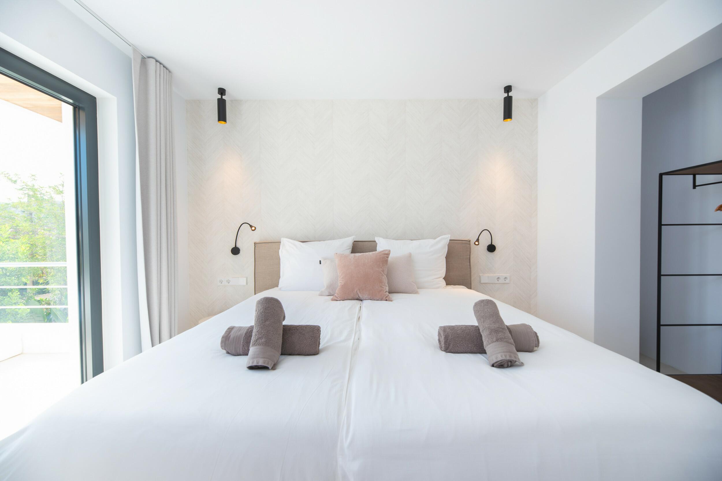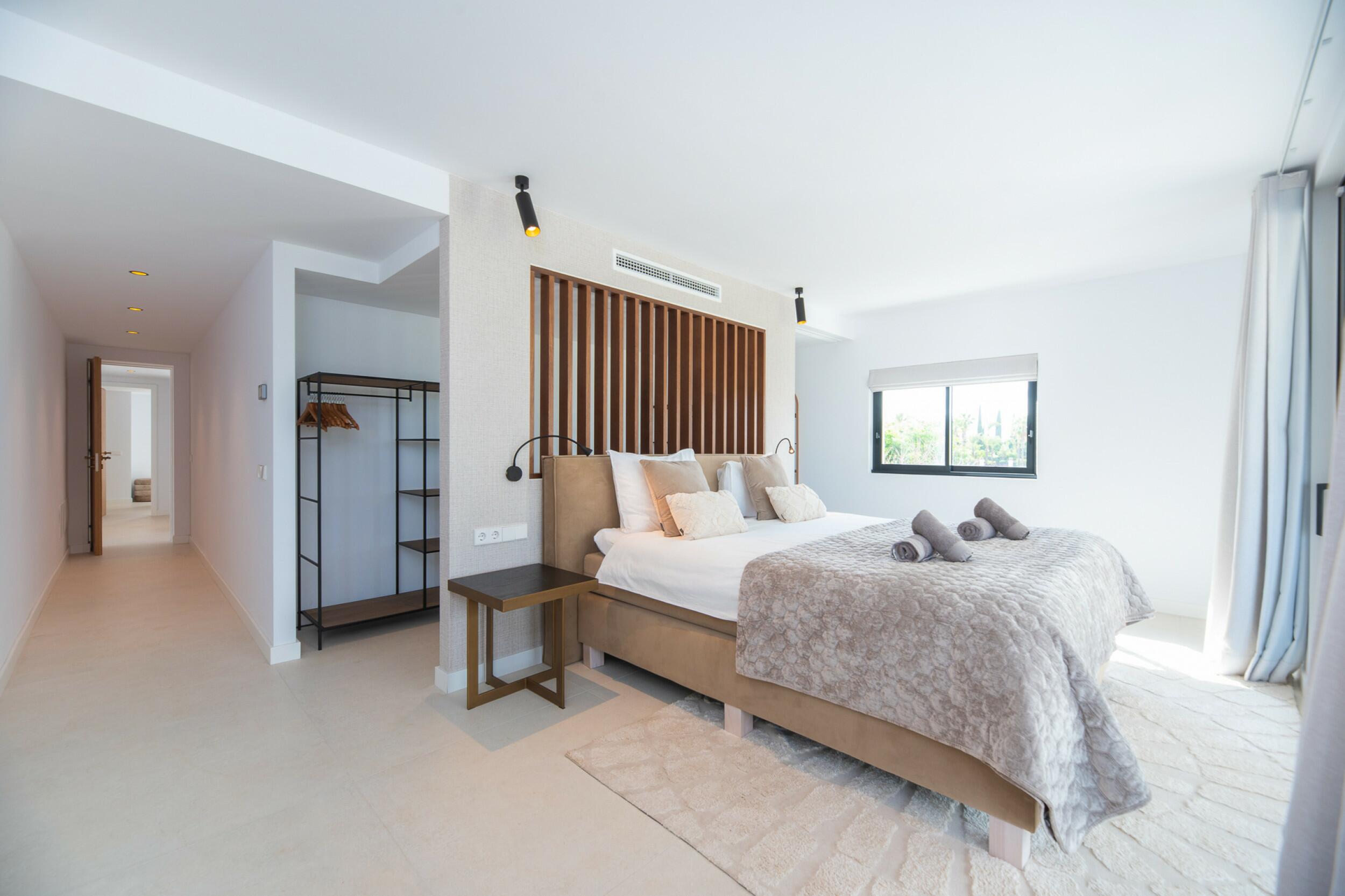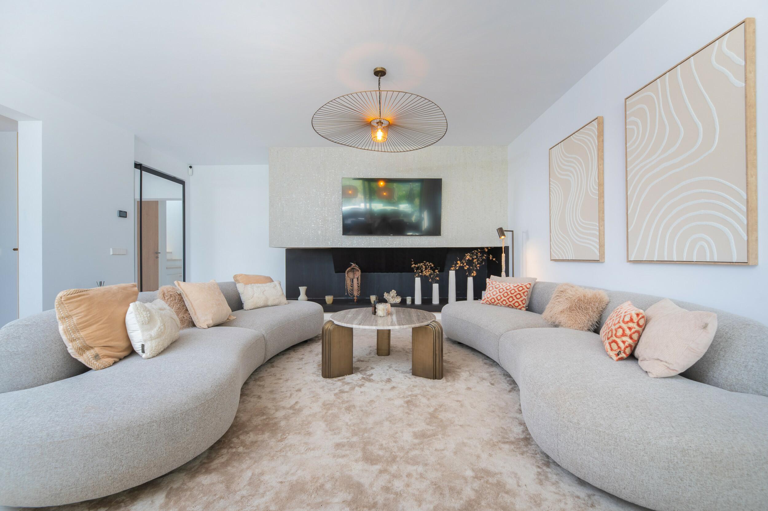 La casa è distribuita su due piani più il seminterrato. All'ingresso principale si accede da una bella scala e si entra in casa attraverso un'elegante porta in legno. Al piano principale si trova un ampio e luminoso soggiorno con grandi finestre e camino, una spaziosa cucina semi-aperta, una sala da pranzo e un bagno per gli ospiti. Sia il soggiorno che la sala da pranzo si aprono su un'ampia terrazza esterna coperta. Al piano superiore si trovano 2 camere matrimoniali che condividono un bagno, una camera doppia con bagno privato e la camera padronale con bagno privato e spogliatoio. Le viste dalle camere da letto sono meravigliose, in quanto si affacciano sul giardino e da alcune camere, o dalle terrazze, si può persino vedere Dalt Vila e Formentera.