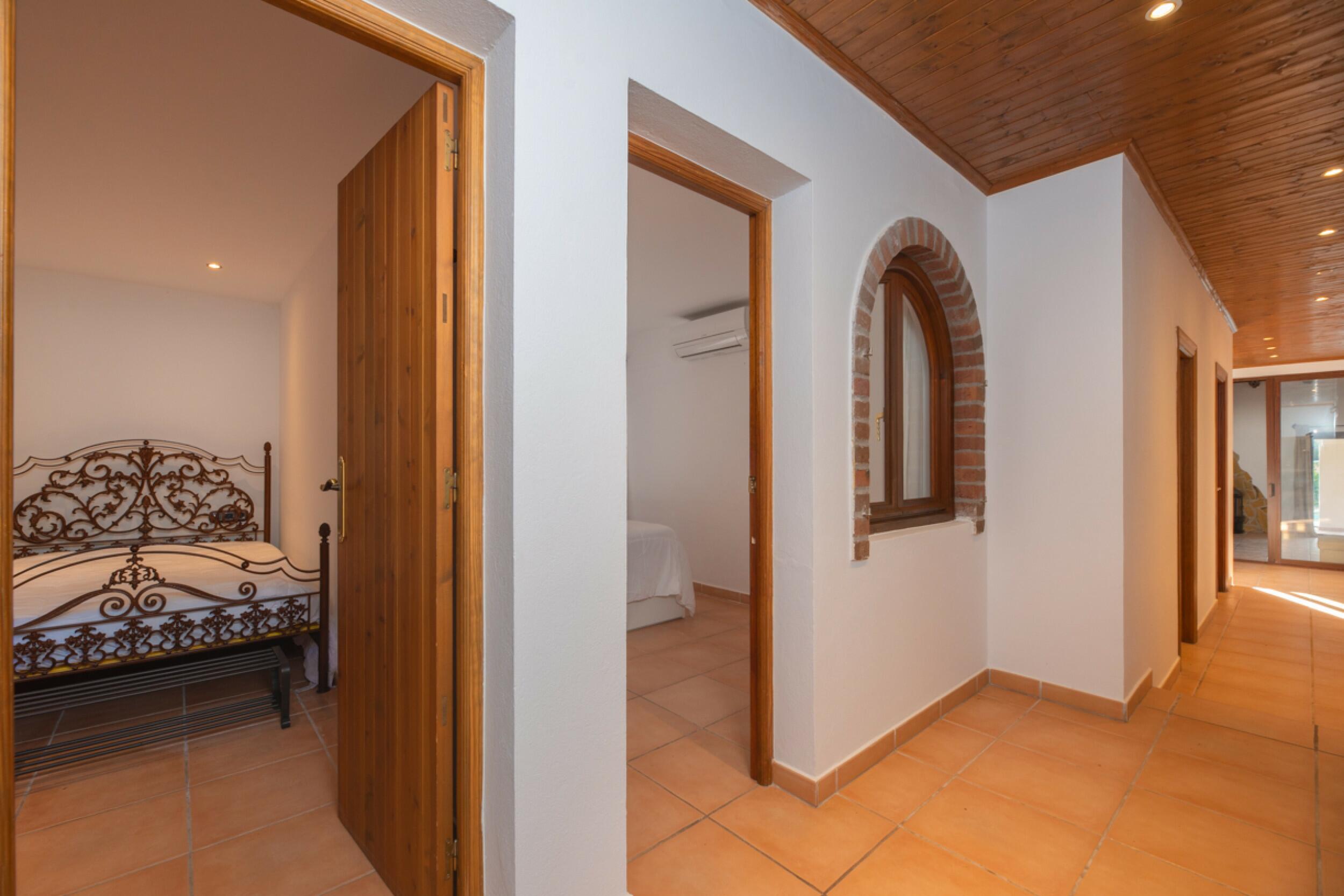 Il primo piano ospita tre camere da letto matrimoniali, ognuna con il proprio bagno privato. La camera da letto principale è più spaziosa e dispone di uno spogliatoio, mentre una delle camere da letto include un camino. Tutte le camere da letto hanno accesso a una terrazza condivisa, da cui si può godere di una magnifica vista sul mare e sulle colline che circondano la villa.