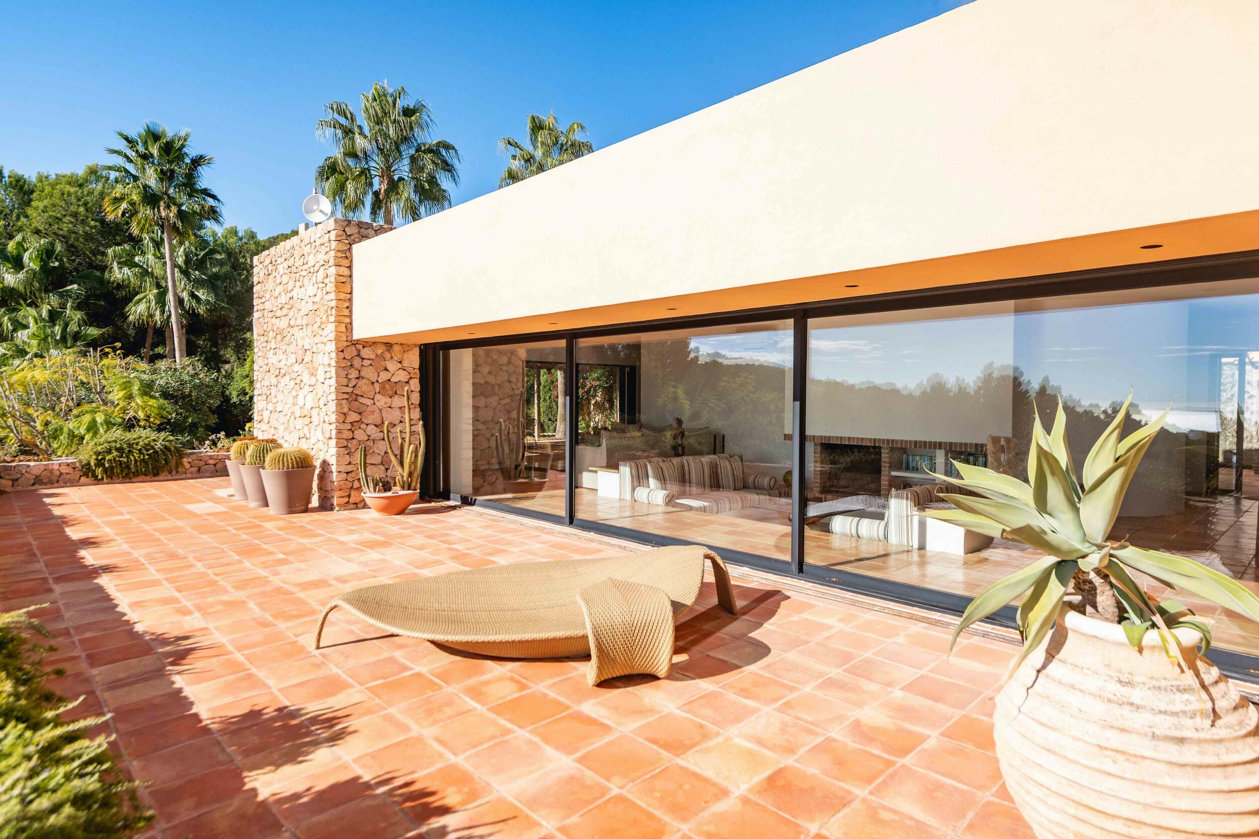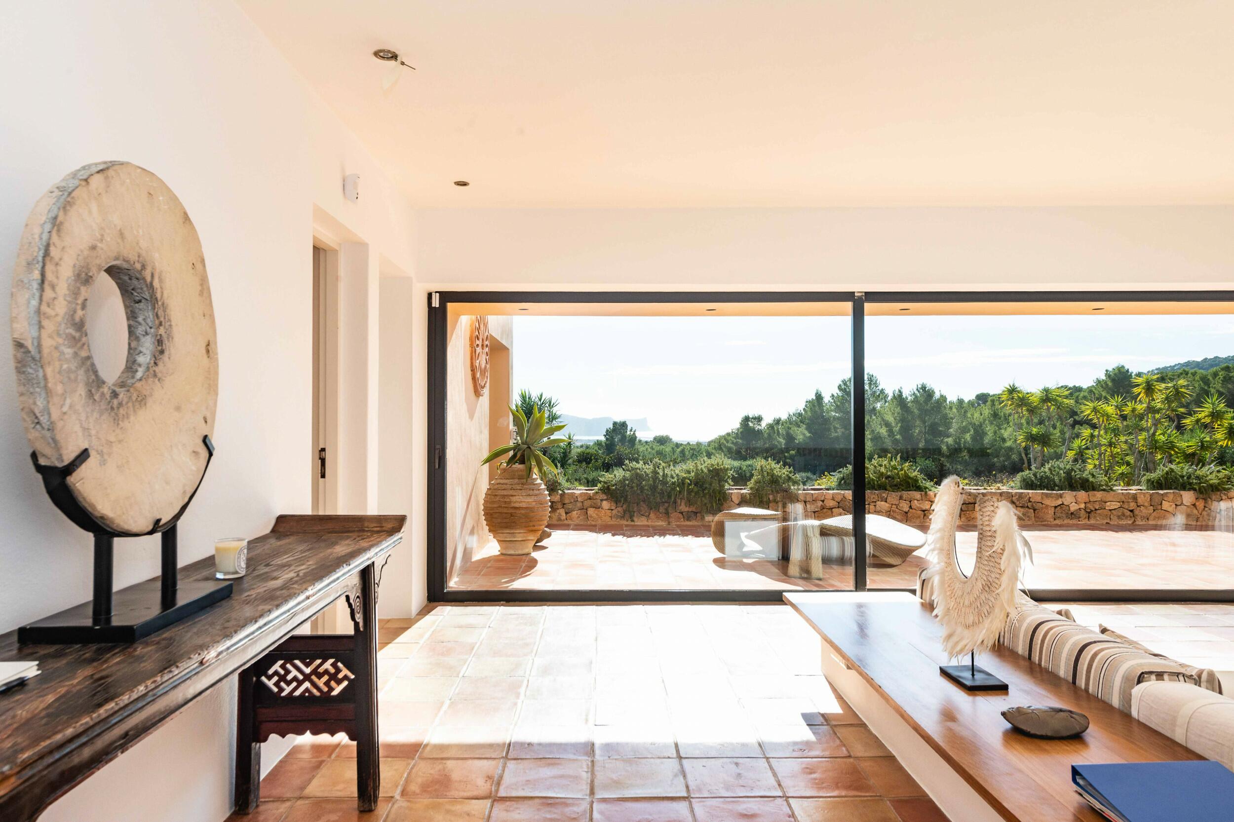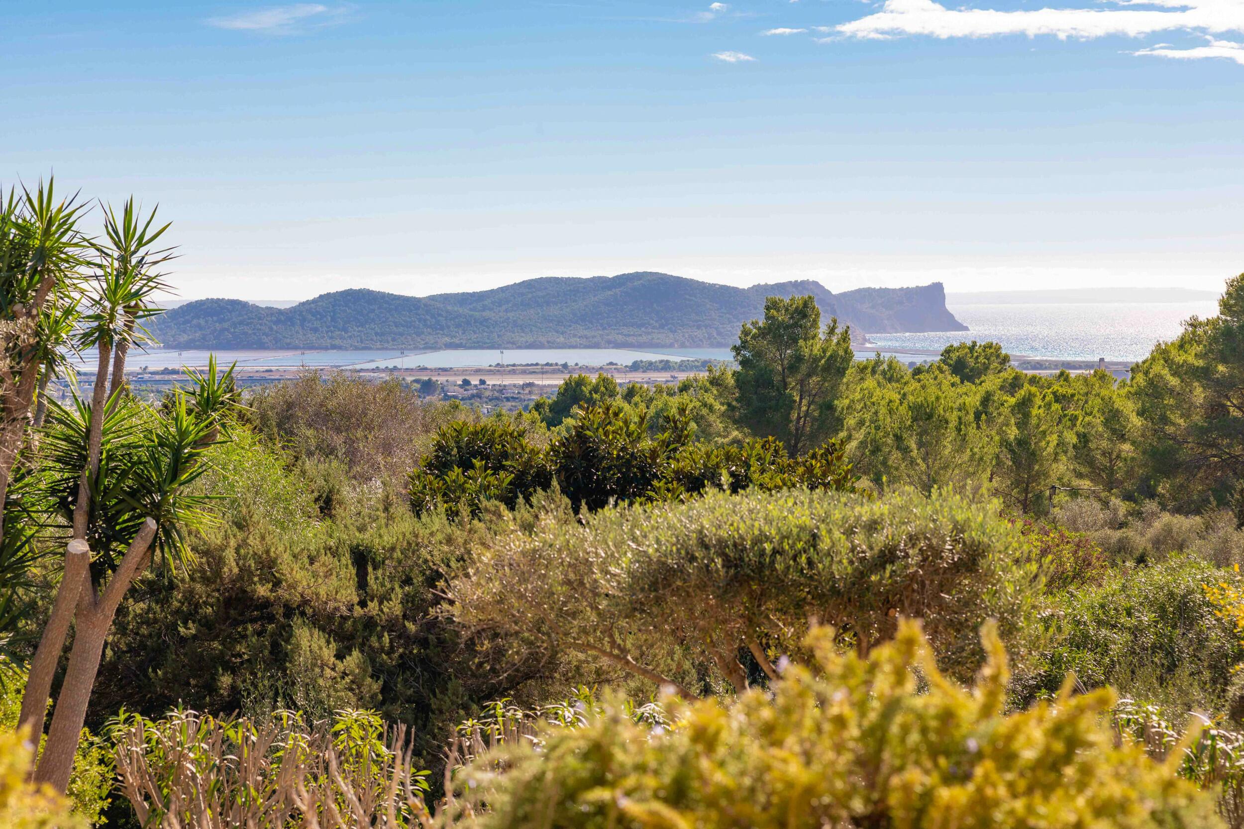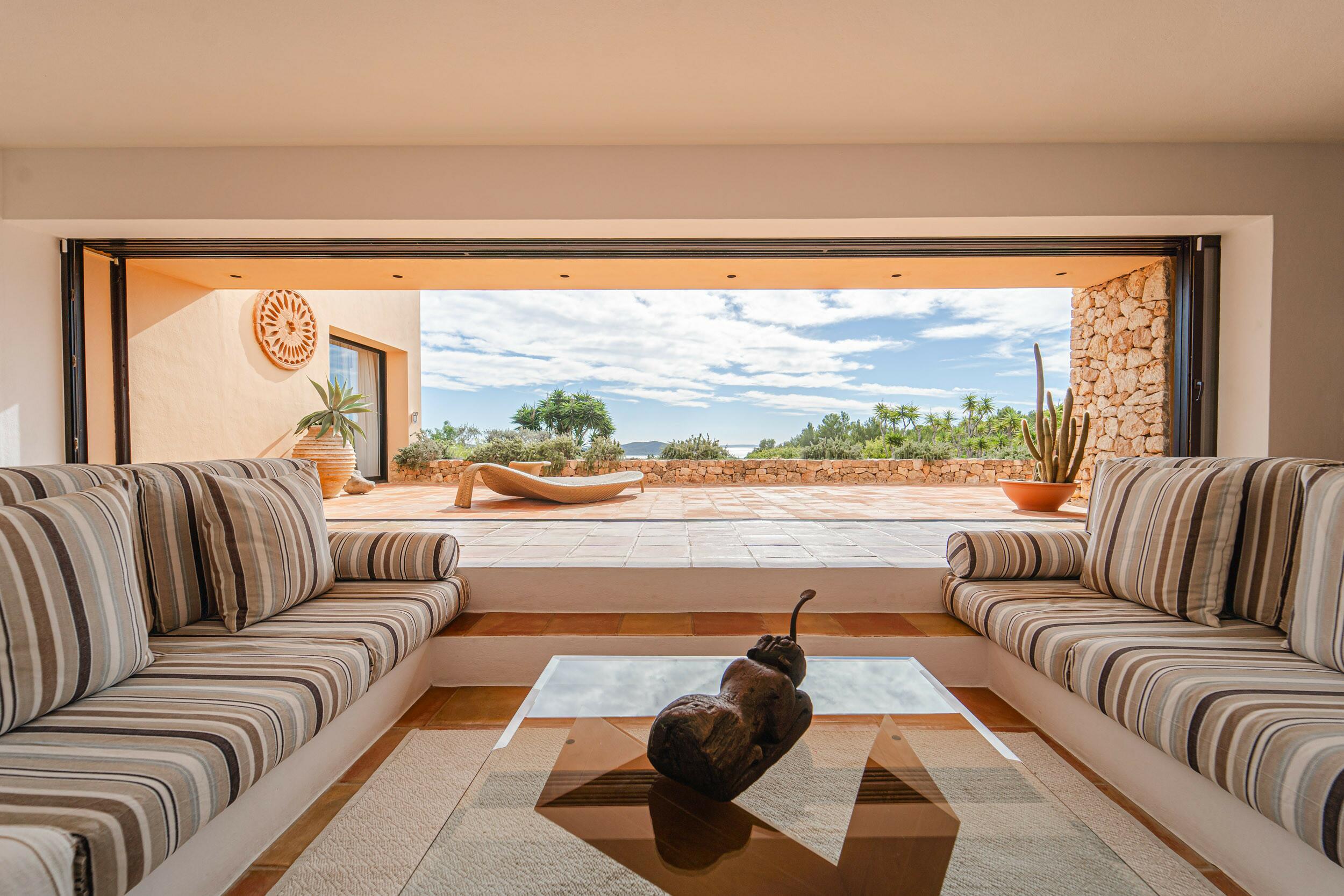 • Terrazza della piscina esposta a sud con vista mare su Cala Jondal e Formentera