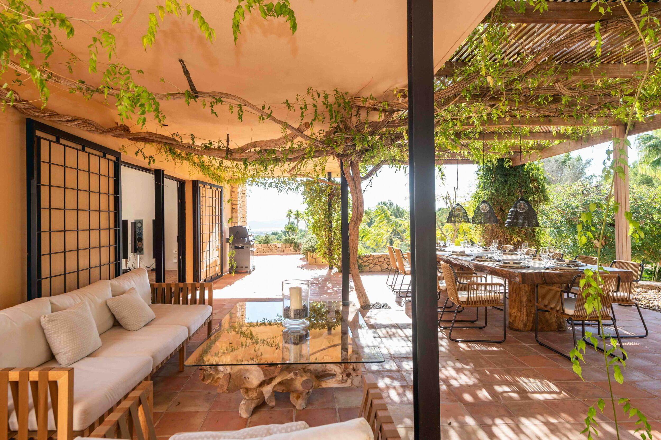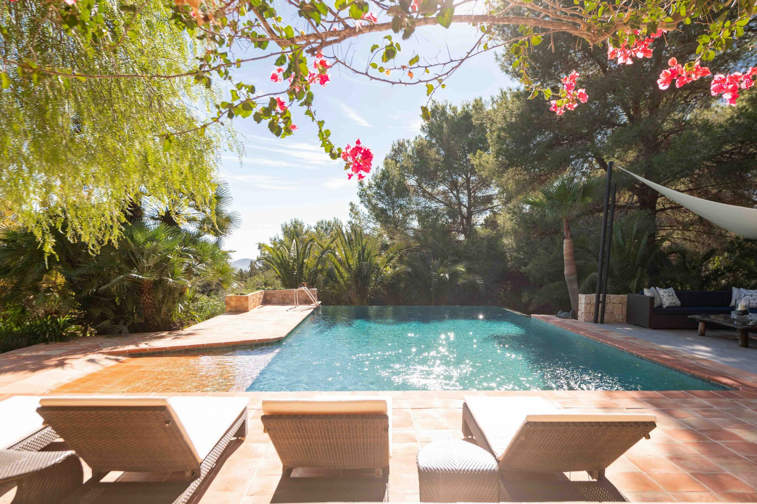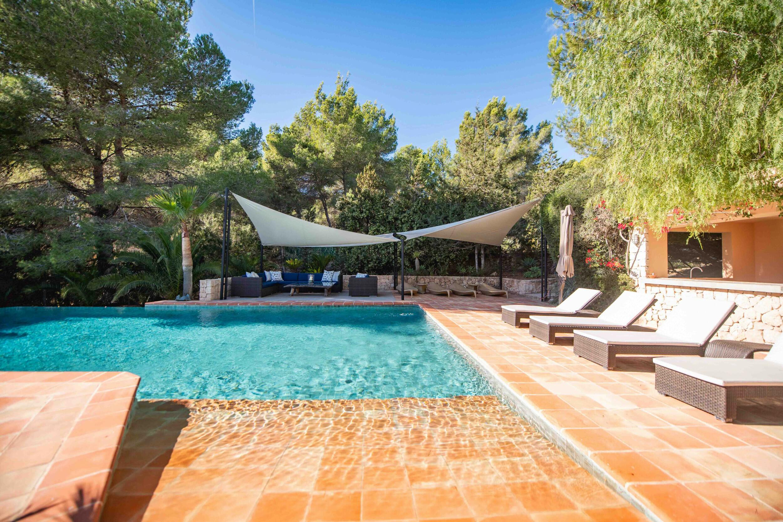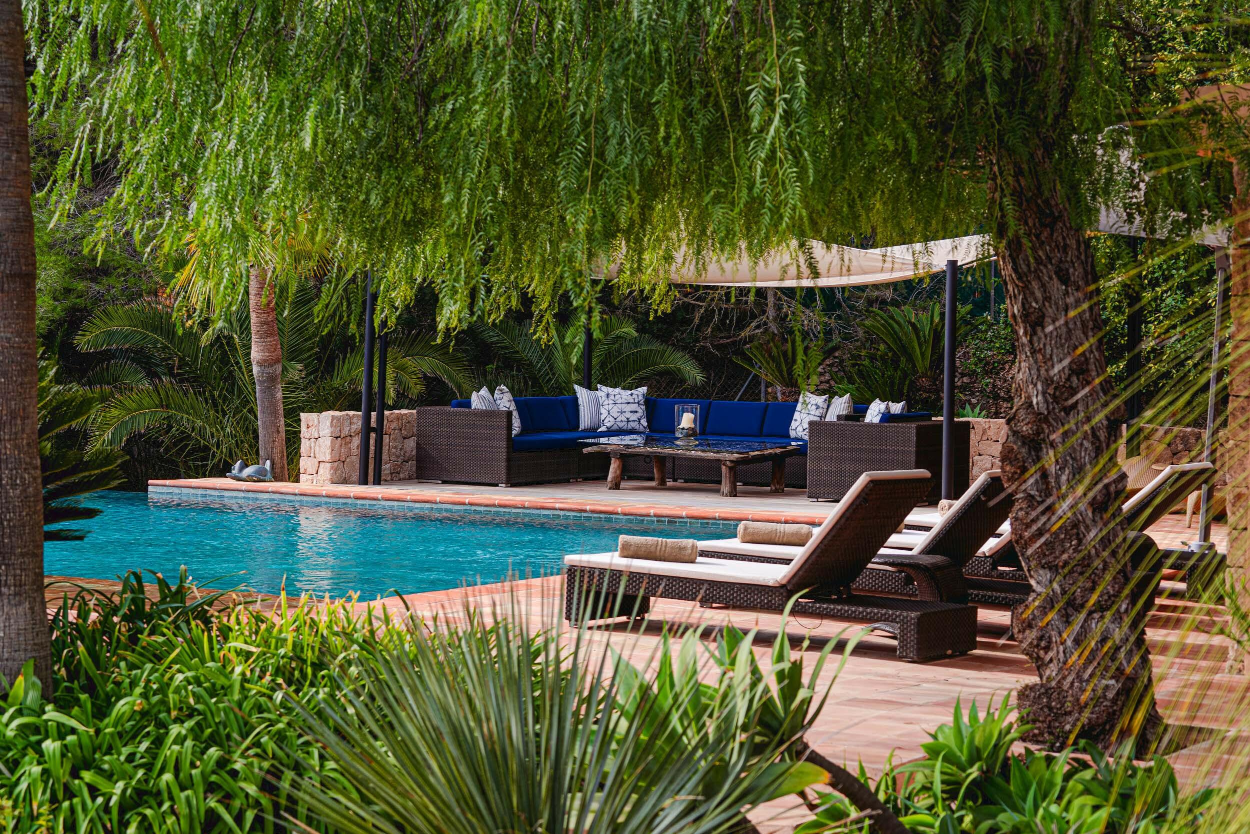 • Terrazza della piscina esposta a sud con vista mare su Cala Jondal e Formentera