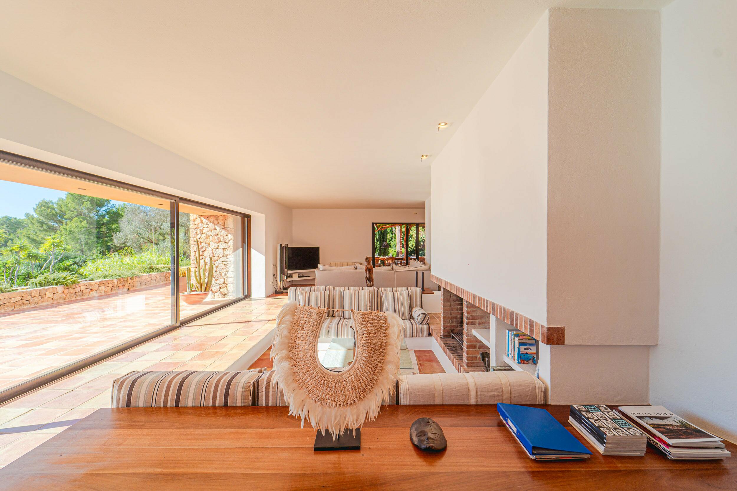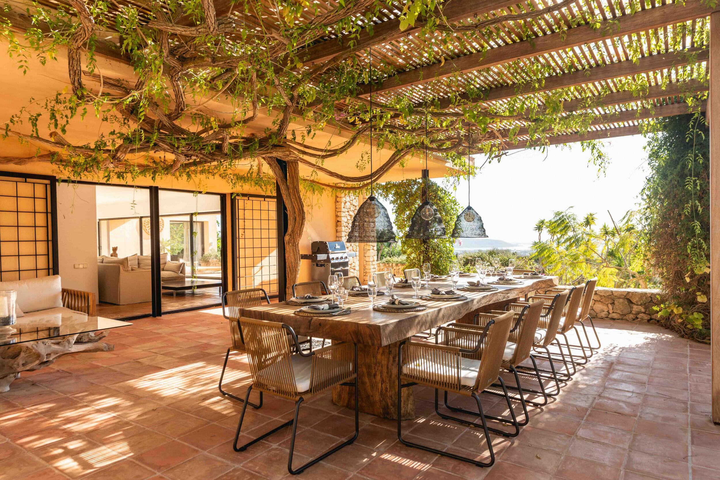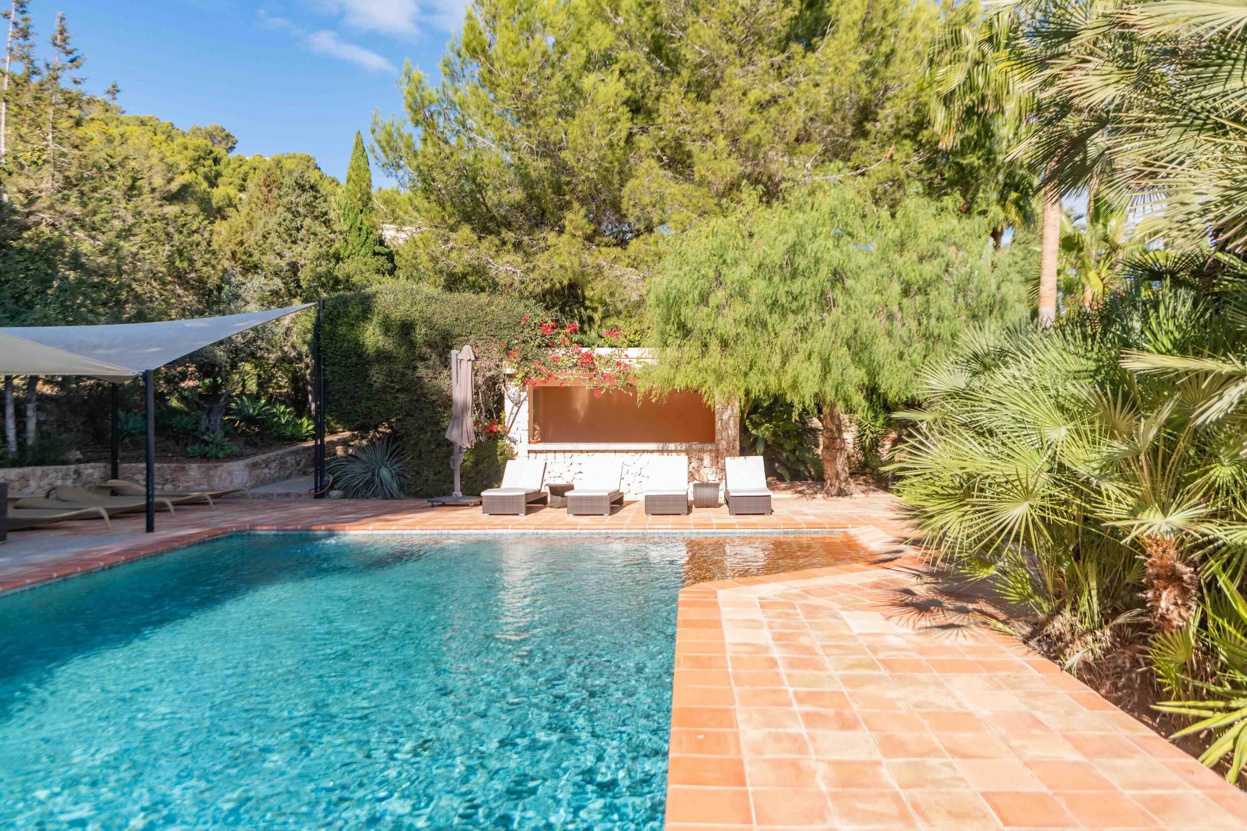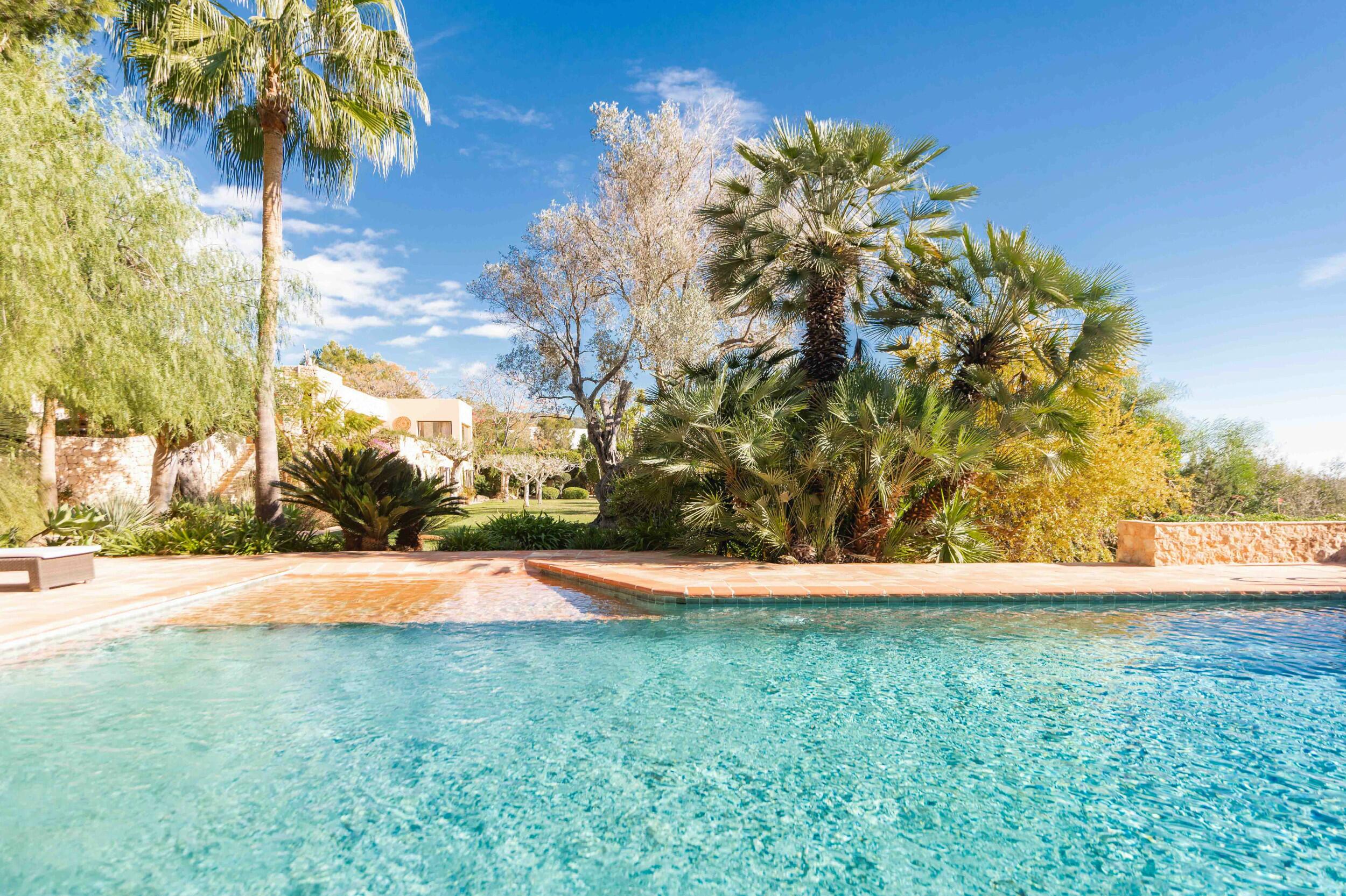• Terrazza della piscina esposta a sud con vista mare su Cala Jondal e Formentera