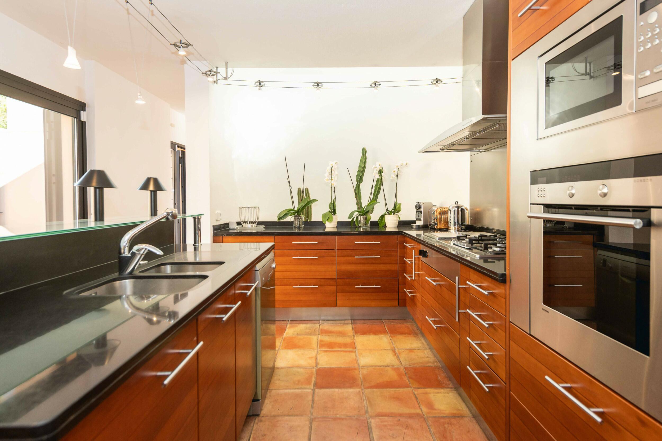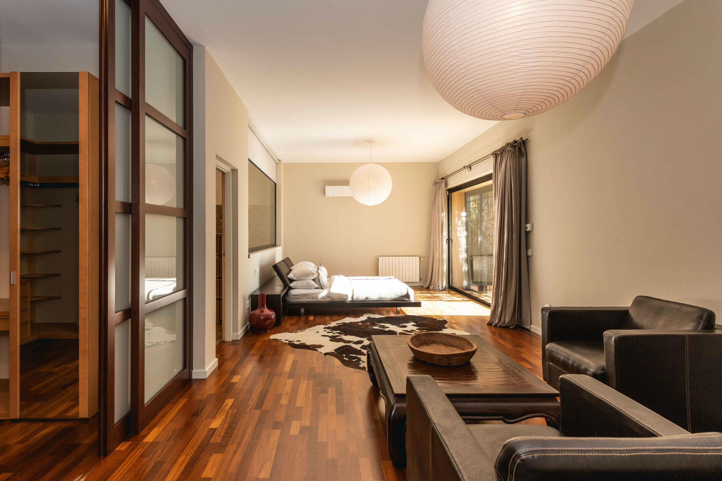 Grandi finestre collegano il soggiorno e la zona pranzo con la cucina completamente attrezzata. Toni bianchi, pietra naturale e arredi contemporanei creano un’atmosfera mediterranea elegante e rilassata. Un ufficio separato offre privacy, mentre Sonos e Wi-Fi ad alta velocità mantengono tutti connessi.