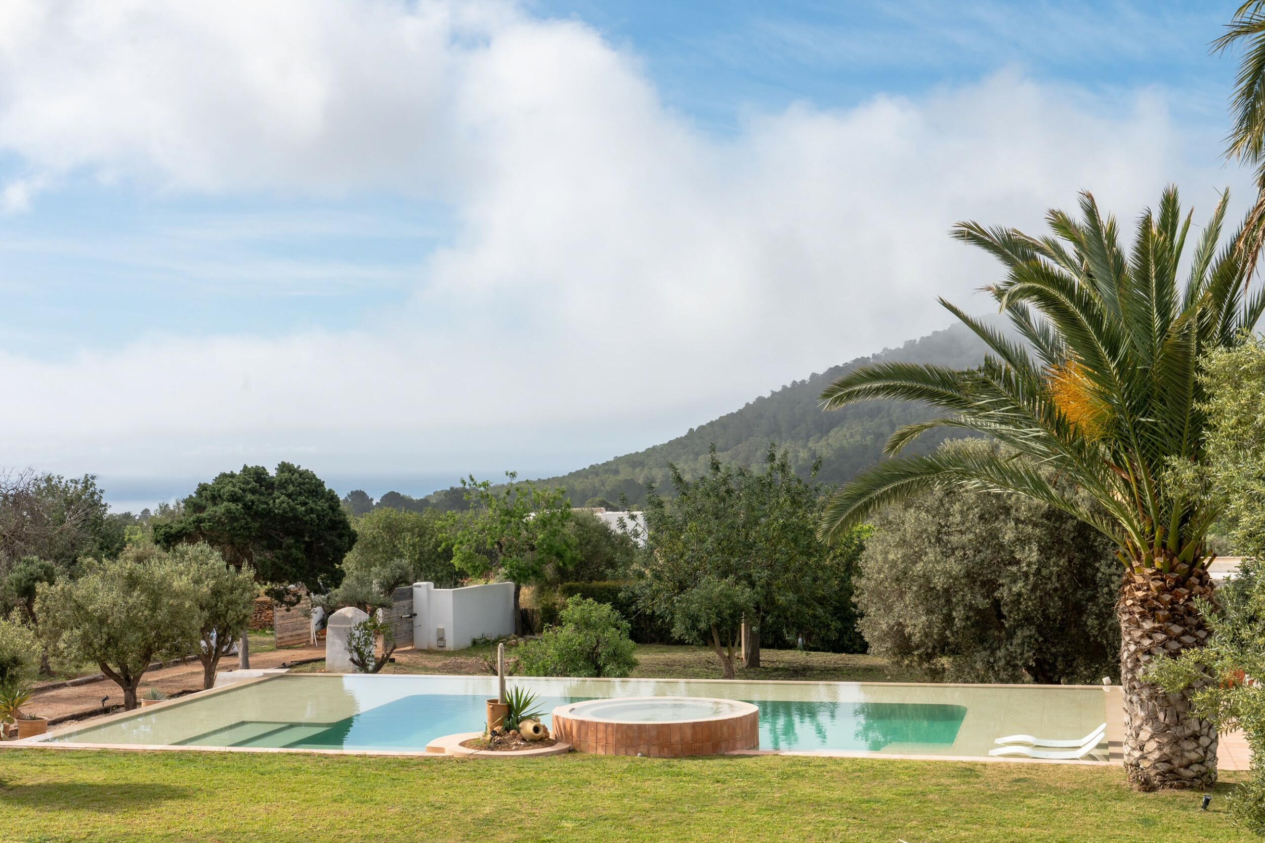 • Piscina a sfioro con jacuzzi centrale e vista mare in lontananza verso Formentera