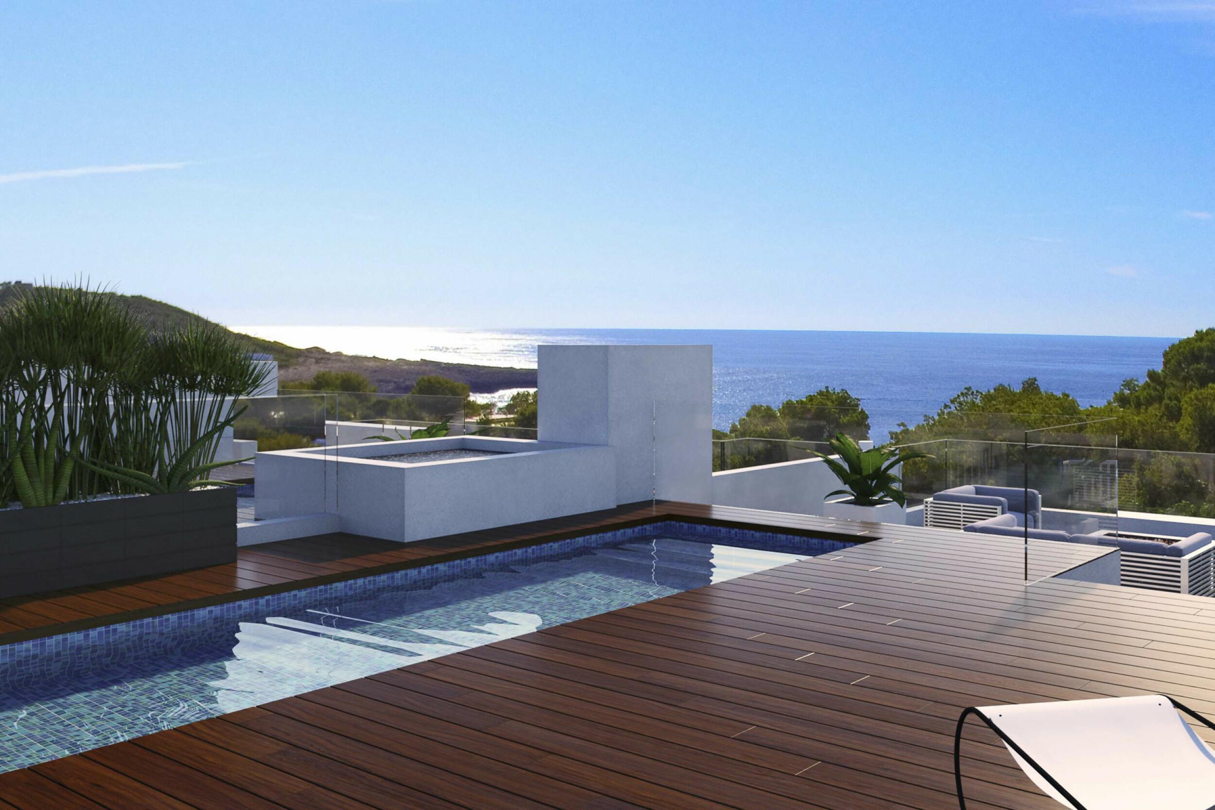Properties for sale in Portinatx, like Villa Marlin Portinatx offers a modern home, just 5 minutes walking distance to the beach. The 1,114 m2 property is newly built and of avant-garde architecture and design. This house faces east towards the sea with 180 degree views and beautiful sunrises. The construction has been recently completed and also comprises a beautiful infinity pool of 66 m2.